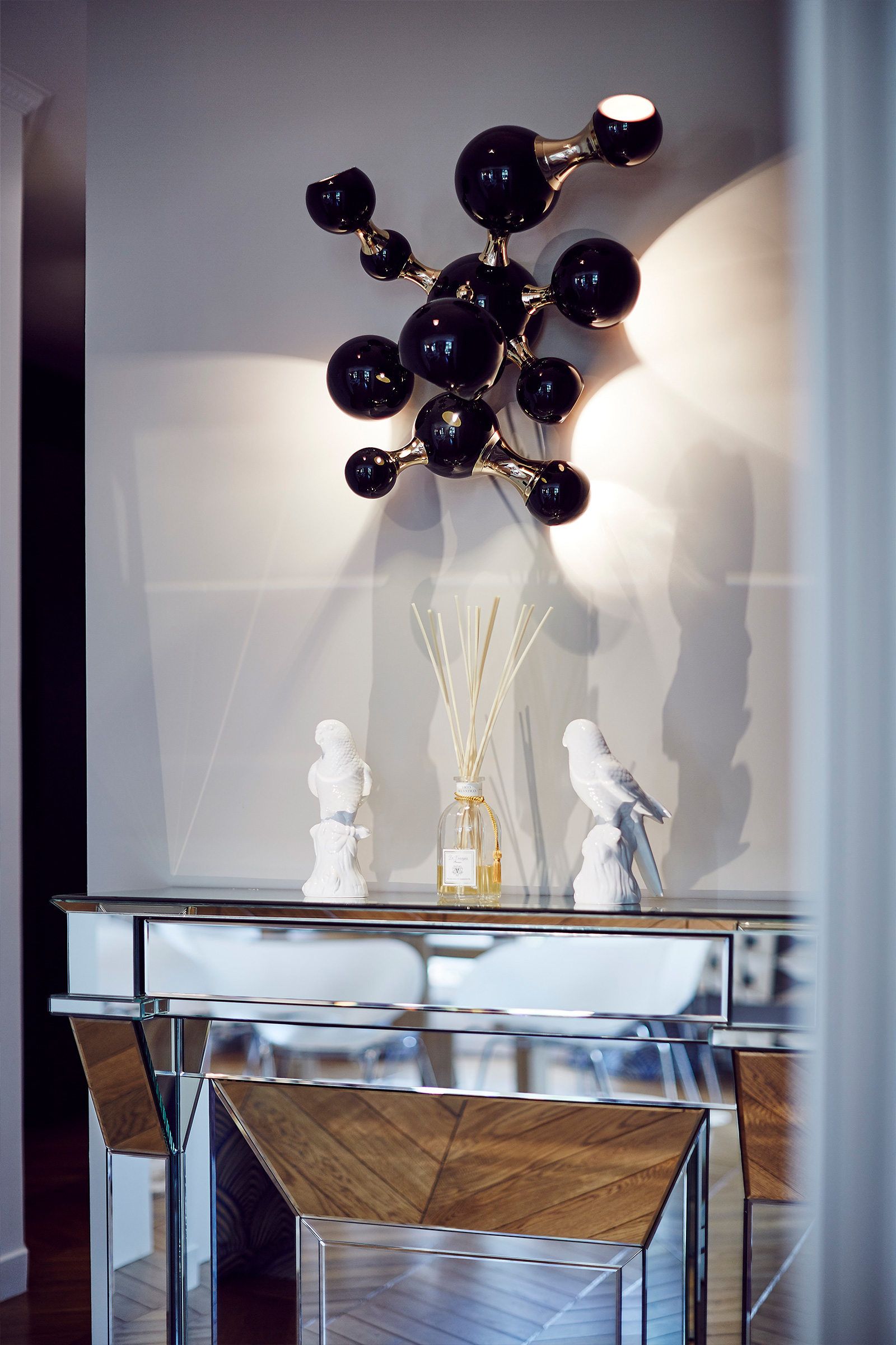 Pour ce projet situé sur les quais de Seine à Paris, chaque recoin a été conçu avec des pièces sur mesure. Les moulures classiques au plafond et la cheminée de style Pompadour instaurent un dialogue fascinant avec les pièces de design de collection. Même les radiateurs ont été réalisés sur mesure et dessinés spécifiquement pour cet espace.